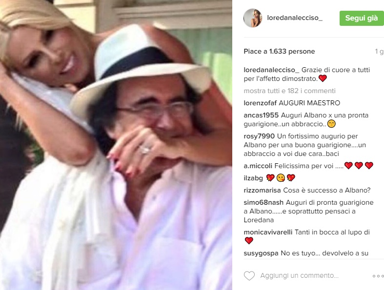 La foto è stata scattata molto probabilmente in questi giorni, mentre Albano è ancora in ospedale, visto che il cantante sembra indossare una vestaglia bianca. Loredana Lecciso si è precipitata immediatamente all’ospedale dopo aver saputo del terribile malore. Albano è stato ricoverato nel tardo pomeriggio di venerdì 9 dicembre a seguito di due attacchi cardiaci. Il cantante tava provando a Roma sul palco dell’Auditorium, a pochi passi da Piazza San Pietro, quando verso le ore 18.00, è stato colpito da due infarti. Poi la corsa in ospedale dove è stato operato d’urgenza. Un intervento durato tre ore, perfettamente riuscito.
