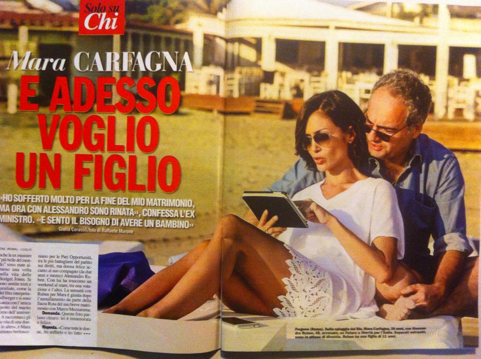 “Ripensandoci, ora sorrido, ma allora l’ho vissuta malissimo – racconta a ‘Chi’ l’ex ministro delle Pari Opportunità – Mi sono ritrovata a un anno dalle nozze, sola, in viaggio per Zanzibar con una mia cara amica. E quello avrebbe dovuto essere il romantico anniversario con mio marito, magari in attesa di un bambino. Mi sono sentita sola e fuori luogo come Bridget Jones”. Mara Carfagna risponde anche a due domande su temi scottanti. Il primo la fecondazione eterologa: “È un tema sul quale mi interrogo. E nutro seri dubbi”. Il secondo, sulle unioni di fatto: “Riconoscimento solo per coppie omosex e nessuna equiparazione al matrimonio”, spiega a ‘Chi’ l’ex ministro. Ed ecco a seguire l’intervista pubblicata dal settimanale diretto da Alfonso Signorini. Nelle foto, accanto alla Carfagna c’è Alessandro Ruben.