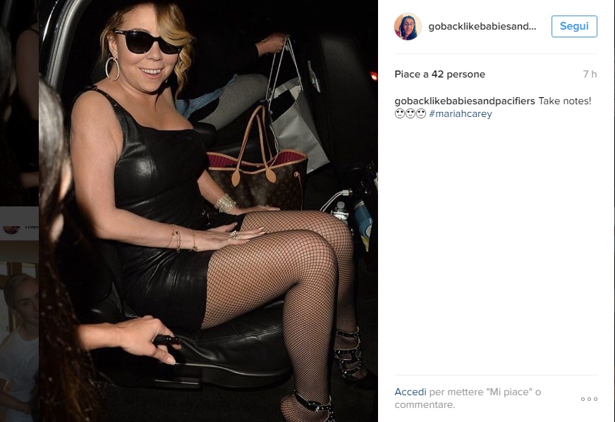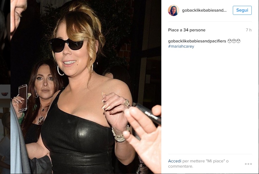 Nelle foto postate anche su Instagram, Mariah scende dall’auto che l’ha portata al ristorante, si fa strada tra i fan, sorride e si ferma a firmare autografi. Una delle due spalle è scoperta; le gambe coperte da delle calze a rete. La star 46enne ha degli occhiali neri malgrado sia notte. Al dito lo splendido anello di fidanzamento da 35 carati che le ha regalato il suo Packer.