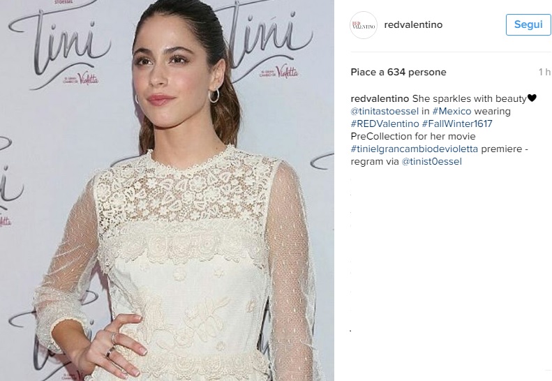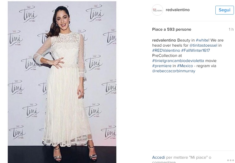 Martina Stoessel, look da sogno: abito lungo nero. Si tratta di un capo firmato Red Valentino, linea dello storico brand, dedicata alla clientela più giovane ed orientata verso una fascia di prezzo lievemente più economica rispetto alle precedenti, marchio di cui è testimonial ormai da mesi. Dopo il trionfo di Violetta, Tini ha debuttato con il suo primo album da solista: “Tini (Martina Stoessel)”, pubblicato da Hollywood Records, un doppio album che contiene i nuovi brani inediti di Martina oltre alle canzoni del film Tini – La Nuova Vita di Violetta.