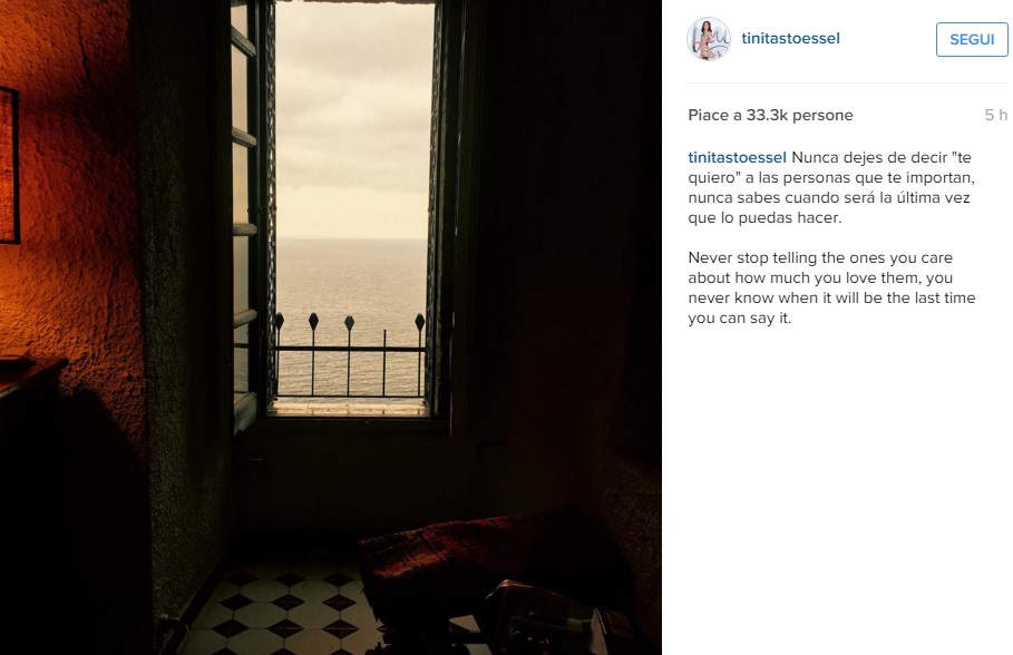 ROMA – Martina Stoessel, messaggio enigmatico su Instagram. La cantante argentina, protagonista della serie Violetta, ha postato una foto sul suo profilo Instagram in cui si vede una stanza che da sul mare. lo scatto è accompagnato dalla dedica: “Non smettere mai di dire “ti amo” alle persone a te care, non si sa mai quando è l’ultima volta che è possibile farlo”. Una frase che fa riflettere, soprattutto se fosse dedicata a quello che dovrebbe essere ancora il fidanzato ufficiale dell’artista, ovvero Peter Lanzani. La coppia era stata fotografata in teneri atteggiamenti all’ultimo Festival del Cinema di Venezia, dove non erano mancati baci in pubblico. Foto che hanno fatto il giro del mondo, considerando i fan della cantante sparsi per il globo.