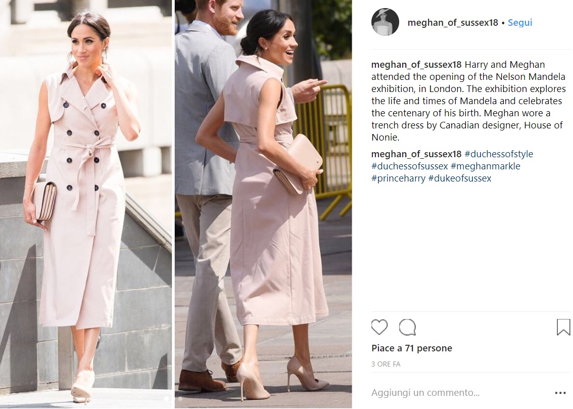 Meghan Markle, moglie del principe Harry, ha indossato un abito stile trench rosa cipria e smanicato del brand canadese Nonie. Una creazione del valore di circa 700 sterline che la Duchessa ha abbinato a clutch Mulberry e scarpe con tacco Dior ton sur ton. Che dire, Meghan era davvero bellissima e, ancora una volta, il suo look ha dimostrato come l’ex attrice dia il meglio di se quando sfoggia look casual invece di ingessarsi in probabili abitini bon ton e cappelli vistosi.