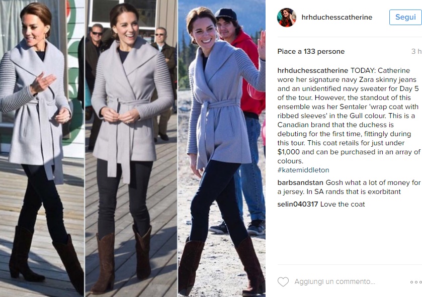 La Duchessa, infatti, ha già sfoggiato un cappotto firmato Sentaler durante il suo viaggio in Canada nel 2016, in occasione della visita a Carcross, quando ha scelto pantaloni skinny del marchio low cost Zara e il delizioso cappottino Sentaler color azzurro ghiaccio con maniche arricciate e cintura in vita. All’epoca, il cappottino ha fatto il giro del mondo ed è diventato sold-out nei negozi nel giro di pochissime ore.