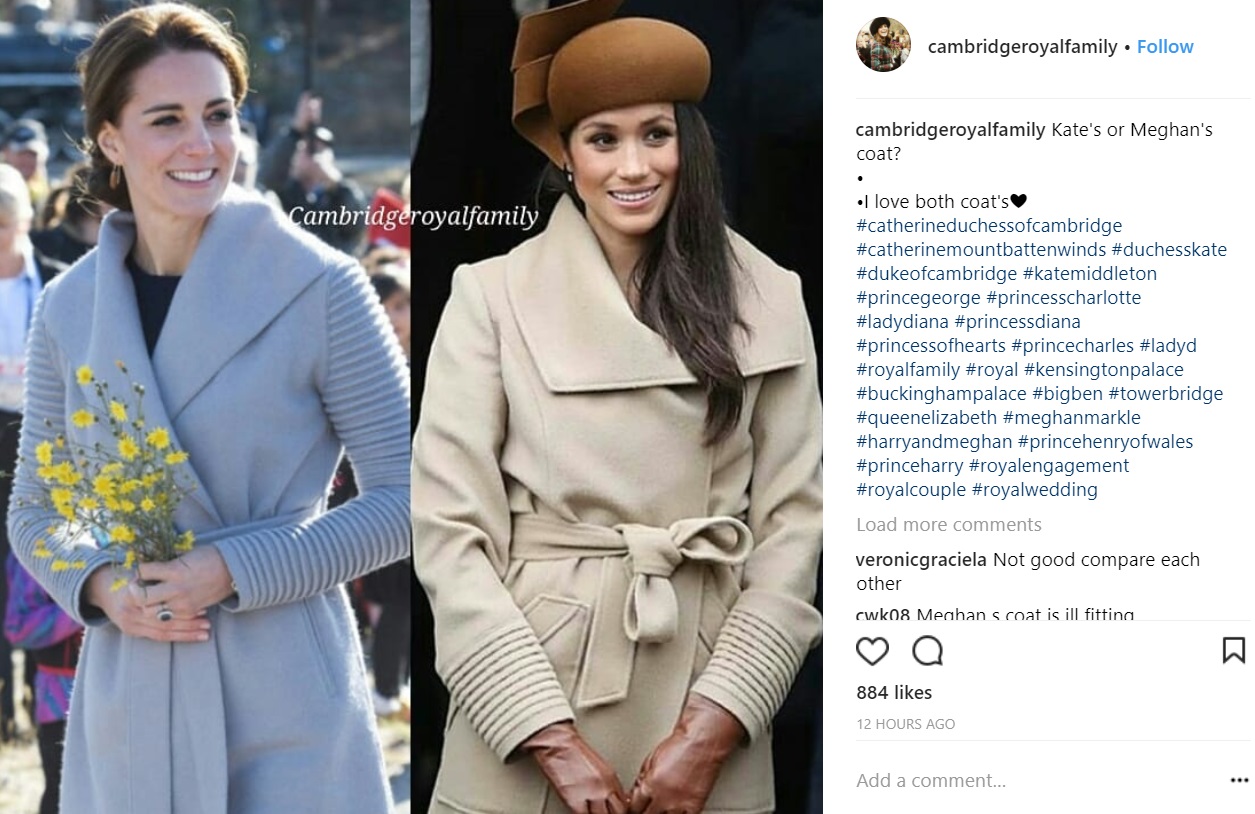 La famiglia reale inglese è stata fotografata all’uscita dalla chiesa di St. Mary Magdalene a Sandrigham, dove ogni Natale partecipa alla tradizionale funzione natalizia. Come c’era da aspettarsi, Kate, William, Harry e Meghan hanno letteralmente conquistato la scena e sono stati i membri della famiglia reale più fotografati in assoluto, nonostante il completino arancio della regina Elisabetta. Kate era deliziosa come sempre, con un cappottino in stile college firmato Miu Miu. Anche Meghan era stilosissima, con un cappottino color cammello firmato Sentaler (1295 sterline), borsa Chloe (1550 sterline) e stivali over the knee Stewart Weitzman (800 sterline). A catalizzare l’attenzione di molti fan della Duchessa è stato proprio il cappotto di Meghan. Secondo molti critici della corona inglese, infatti, la scelta di quel capospalla sarebbe un omaggio a Kate.