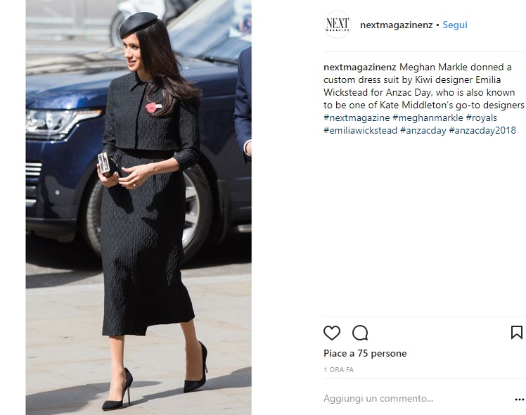 LONDRA – Meghan Markle look: sofisticata e chic in abito nero FOTO. Meghan Markle ha catalizzato l’attenzione dei fotografi in occasione della commemorazione di caduti in guerra australiani e neozelandesi che ha avuto luogo a Londra. La futura moglie di Harry è apparsa sofisticata e chic con un completo nero formato da gonna a matita lunga fin sotto il ginocchio e giacchina. La scelta dell’abito non è stata casuale: si tratta infatti di una creazione firmata Emilia Wickstead, stilista e designer di origini neozelandesi. Cappellino e scarpe con tacco, entrambi neri, hanno completato la mise total black. Unica nota di colore, la spilla rossa per la commemorazione. Ancora una volta Meghan ruba la scena a tutti e dimostra il suo gusto impeccabile in fatto di moda.
