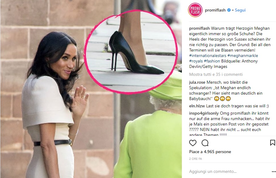 LONDRA – Meghan Markle sceglie sempre scarpe di un numero più grande e c’è un motivo preciso. Che Meghan Markle sia ormai considerata una icona di stile e di moda è cosa nota, non c’è look della Duchessa di Sussex che venga ammirato da migliaia di ragazze in tutto il mondo. Se sei una fan di Meghan, però, avrai certamente notato un particolare nei suoi look: le sue scarpe con il tacco sono sempre di almeno un numero più grande rispetto al suo piede, e c’è un motivo ben preciso.