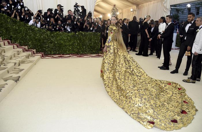 Per Rihanna un “Papa couture” griffato Margiela e completo di tiara sulla testa. Kim Kardashian in Versace con abbondanza di croci. Stessa maison per Blake Lively, Gigi Hadid, Katy Perry, Irina Shayk, mentre Jennifer Lopez in Balmain. Madonna in Gaultier con corona “da Madonna”. La premio Oscar Frances McDormand in Valentino. Jared Leto in Gucci. Cardi B in Moschino. Ali monumentali da arcandelo per Katy Perry. Il red carpet si e’ tinto di arcobaleno: Lena Waithe di “Master of None” ha fatto suo ingresso con una cappa “rainbow”, omaggio al movimento per diritti dei gay, firmata Wes Gordon per Carolina Herrera: “E’ la pelle di cui sono orgogliosa. Il tema di oggi e’ sii tu stessa. Sei fatto a immagine e somiglianza di Dio, non e’ vero?”