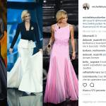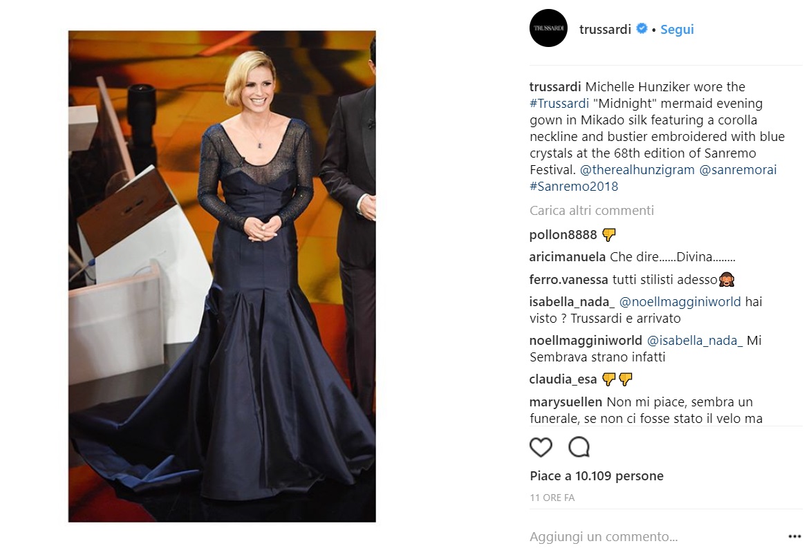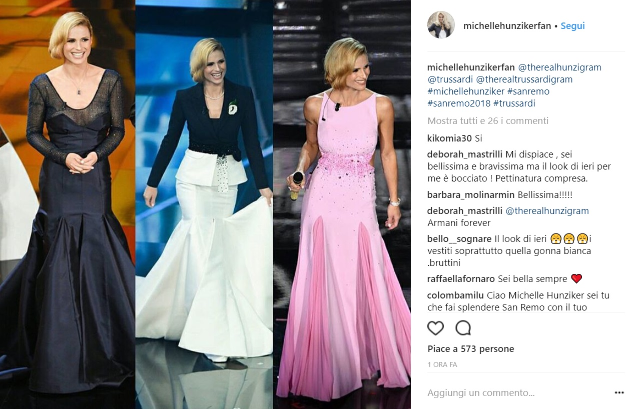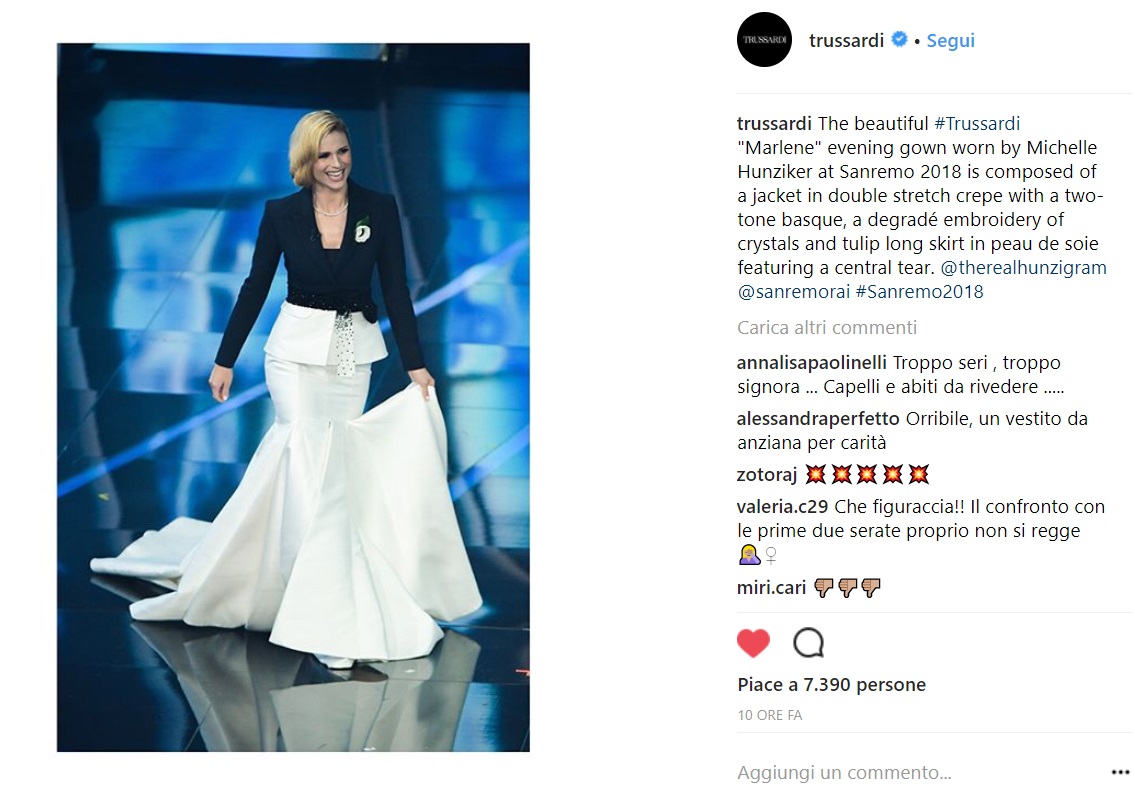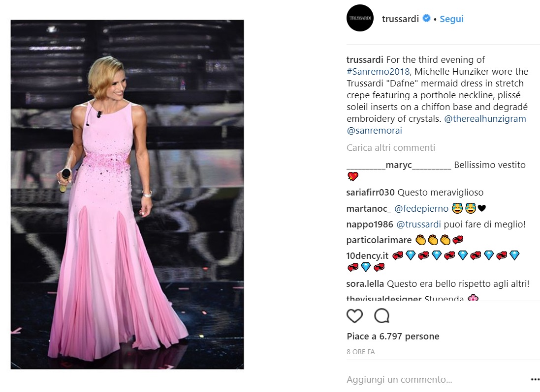 Bene il primo abito, in un romantico blu notte, con scollatura velata e gonna ampia. Non ha pienamente convinto il secondo abito, bianco e nero, composto da giacca e gonna lunga a sirena che ricordava vagamente gli show televisivi fastosi anni ’80. Un buon vestito che, però, non sembrava adatto alla spontaneità e semplicità di Michelle Hunziker che appariva vagamente ingessata. Colore perfetto quello del terzo abito, un rosa pastello adatto a Michelle. Si trattava di un abito lungo impalpabile che calzava alla perfezione alla conduttrice e che esaltava il suo fisico slanciato e tonico. Nel complesso, ci saremmo aspettati almeno un abito dal Dna di Trussardi. Un completo elegante formato da giacca e pantalone forse avrebbe espresso meglio la vera essenza della casa di moda. Peccato, occasione mancata.