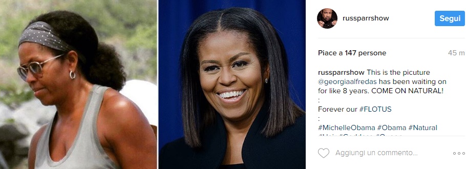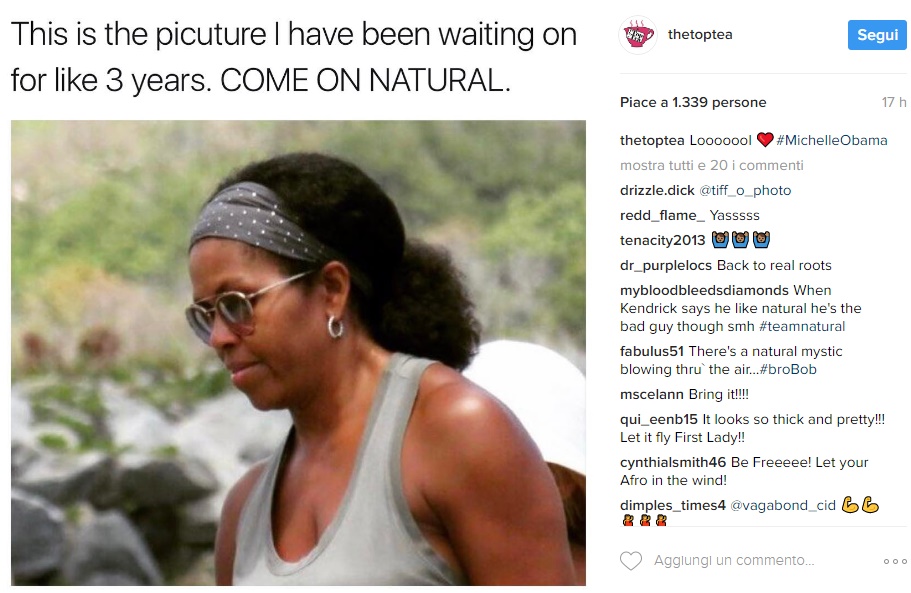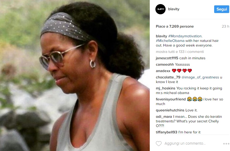 In queste ore ha fatto il giro del web una foto di Michelle con la chioma al naturale: bandana in testa e capelli riccissimi, assolutamente in stile afro, la moglie di Barack è stata pizzicata in versione super casual.