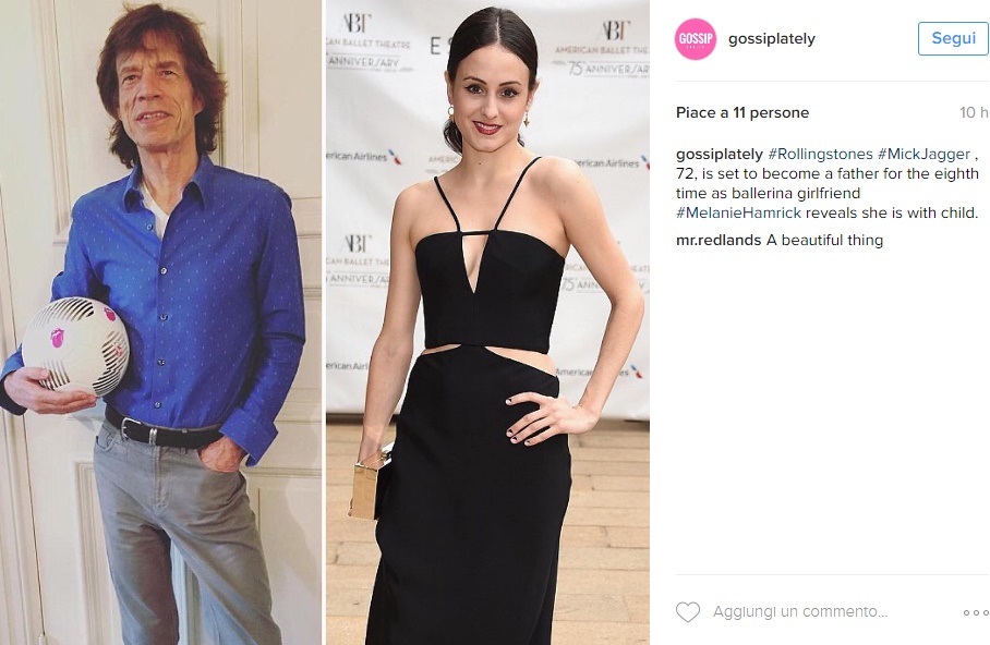 LOS ANGELES – Mick Jagger papà a 72 anni: figlio da fidanzata Melanie Hamrick. La star del rock è inarrestabile, in tutti i fronti: all’età di 72 anni sarà padre per l’ottava volta. La sua fidanzata 29enne, Melanie Hamrick, aspetterebbe un bambino dal cantante dei Rolling Stones. A lanciare il gossip è il The Sun, secondo cui Mick Jagger aspetterebbe l’ottavo figlio dalla compagna ballerina Melanie Hamrick. La notizia fa notizia non solo perché il cantante ha 72 anni ma anche per via dell’incredibile differenza di età tra i due: Melanie, infatti, ha appena 29 anni. Tra i due, quindi, ci sono 43 anni di differenza.