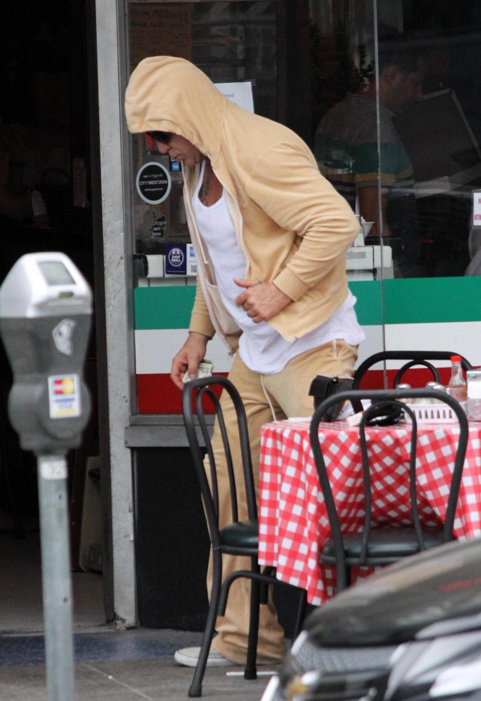 Eccolo fuori da una pizzeria di Los Angeles: tuta giallina sopra una discutibile canottiera candida. Le braccia coperte di tatuaggi, gli occhiali da sole perenni e un cappellino.