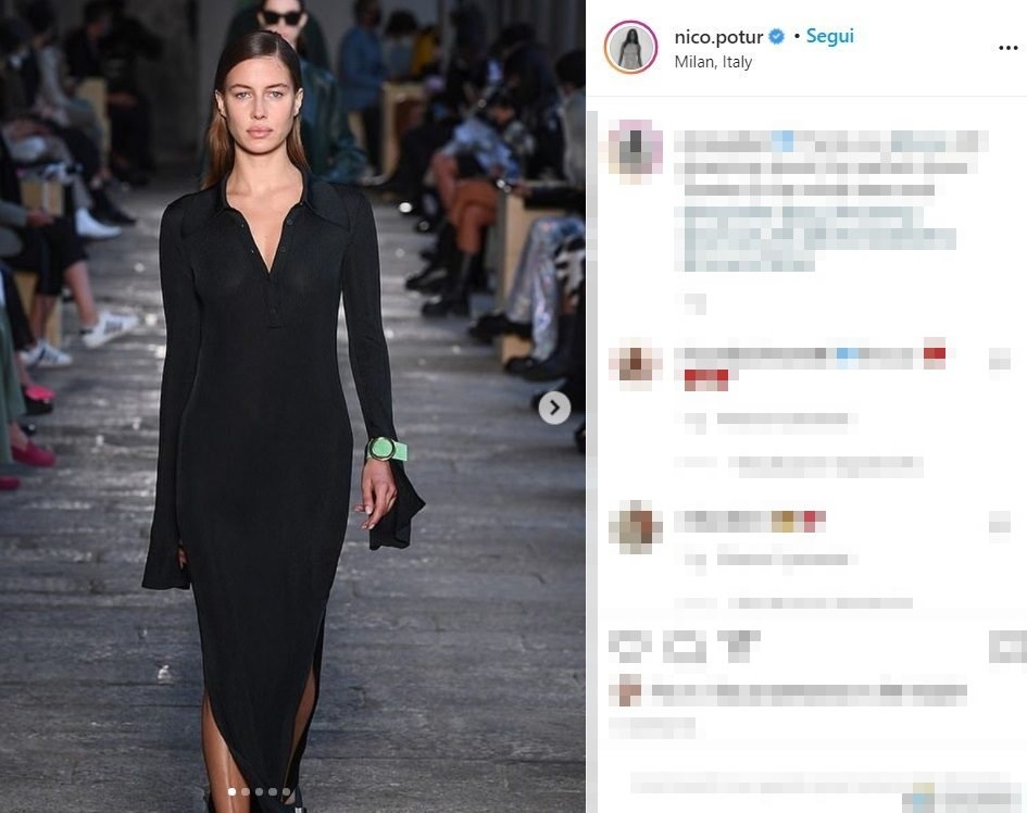 Nicole Poturalski, 27 anni, nota soprattutto per il suo lavoro di modella, ha partecipato alla sfilata primavera / estate 2020 di Hugo Boss venerdì 25 settembre scorso. Nicole ha pubblicato le foto della sua sfilata sul suo profilo Instagram, che conta già più di duecentomila follower. La modella ha condiviso diversi scatti di se stessa in passerella, mentre indossa un maxi abito in maglia nera con spacchi laterali, un braccialetto con fibbia di colore acquamarina e sandali flat.