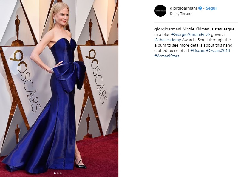 LOS ANGELES – Oscar 2018, Nicole Kidman best dressed: abito blu Armani. L’attrice australiana vince la sfida di look sul red carpet della manifestazione cinematografica più attesa dell’anno. Kidman ha optato per un elegante vestito lungo con spacco e fiocco nella parte anteriore. Un capo che metteva in risalto la straordinaria eleganza dell’attrice, che da anni si affida alle sapienti mani dello stilista italiano. Il colore blu è stato scelto anche da Jennifer Garner, che ha scelto Versace.