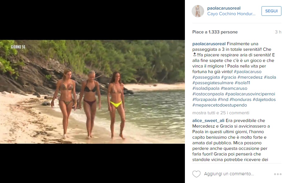 Serenità sull’Isola: gli ultimi giorni di permanenza sull’Isola sembrano avere portato finalmente un clima di serenità tra i naufraghi. Paola Caruso, Gracia De Torres e Mercedesz Henger si sono concesse una passeggiata e hanno chiacchierato amabilmente. Più tardi, la Caruso ha commentato: