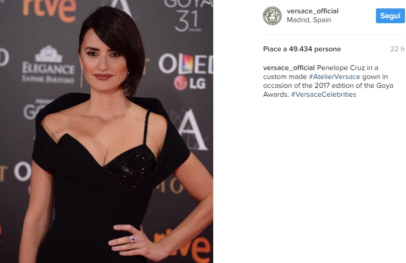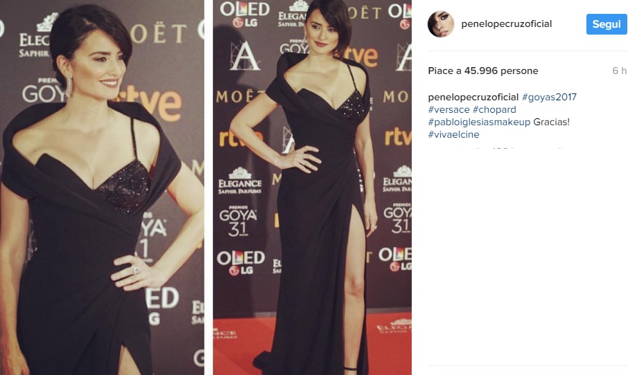 MADRID – Penelope Cruz total black: abito Versace ai Goya Awards 2017, il più importante riconoscimento cinematografico spagnolo, attribuito ogni anno dall’Academia de las Artes y las Ciencias Cinematográficas alle personalità del mondo del cinema che si sono maggiormente distinte nel proprio settore. L’attrice spagnola, 42 anni, è apparsa raggiante con il suo outfit.