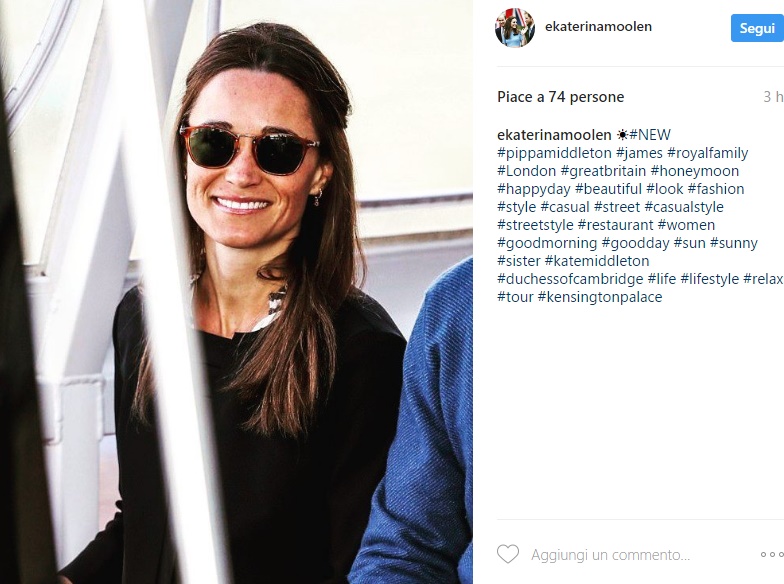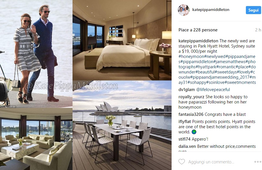 Dopo una settimana sul paradisiaco atollo di Teriaora in Polinesia (che in passato fu di marlon Brando), la coppia di neo-sposini è volata a Sydney per qualche giorno di luna di miele in Australia. Pippa e James sono stati pizzicati per le strade di Sydney mano nella mano, un giro in taxi boat e poi tappa in un ristorante sull’acqua, a nord della città.