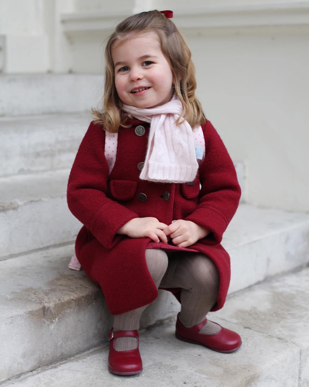 LONDRA – Il Duca e la Duchessa di Cambridge sono lieti di condividere due fotografie della principessa Charlotte a Kensington Palace scattate da Kate Middleton in persona, poco prima che la piccola fosse accompagnata al primo giorno di asilo nido alla scuola materna di Willcock. Che dire: sorrisetto vispo e occhietti furbi, Charlotte è davvero una bimba dolcissima! Per l’occasione, Charlotte indossa un delizioso cappottino bordeaux. Se volete acquistarlo anche voi, il cappottino è firmato Amaia e costa “solo” 120 sterline, un prezzo piuttosto abbordabile. Kate Middleton ama molto questo marchio per bambini e lo sceglie spesso anche per George. Sfortunatamente, online il cappottino è già andato a ruba ed è completamente sold-out ma date un’occhiata al sito: ci sono numerosi modelli molto simili a quello di Charlotte.