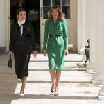 WASHINGTON – Rania di Giordania, Melania Trump: sfida di look FOTO. Bianco e nero per la prima, verde smeraldo per la seconda: la First Lady americana Melania Trump e la regina Rania di Giordania sono state fotografate insieme in occasione dell’incontro tra il re di Giordania Abdullah II e il presidente USA Donald Trump. Le due bellissime donne hanno letteralmente catalizzato l’attenzione dei fotografi con dei look chic e glamour. Per l’occasione Melania Trump ha sfoggiato un abito di lana verde dello stilista francese Hervé Pierre. Rania di Giordania ha indossato un tailleur bianco e nero destrutturato con contrasti oro e profili asimmetrici. Entrambe hanno scelto di mettere una cinturina in vita che metteva in risalto il vitino da vespa. Altro particolare in comune il dettaglio del foulard che rendeva i look chic e glamour.