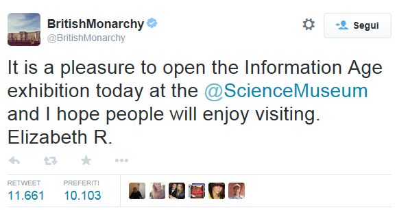 LONDRA (REGNO UNITO) – La regina Elisabetta II ha firmato il suo primo tweet. L’ha fatto attraverso il profilo ufficiale @BritishMonarchy durante una visita alla prima galleria permanente dedicata alla storia della tecnologia dell’informazione e delle comunicazioni nel Museo della Scienza di Londra.