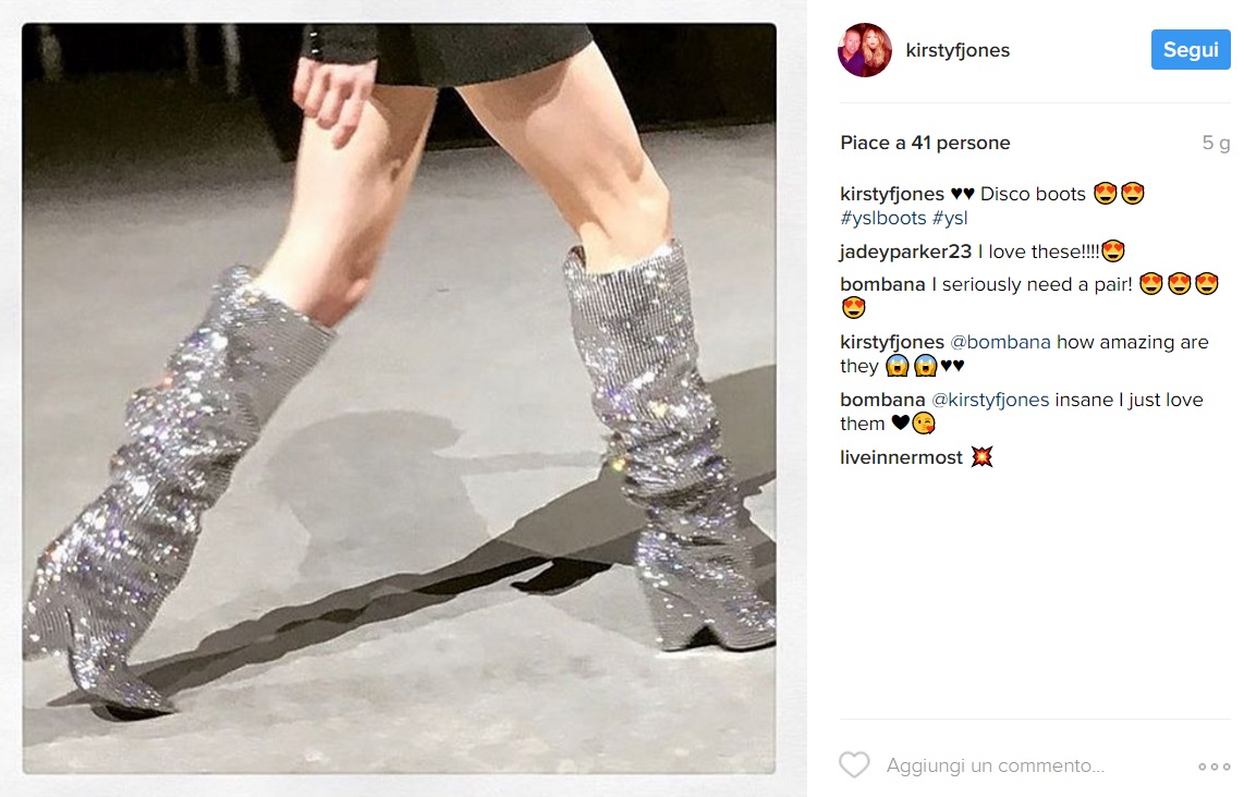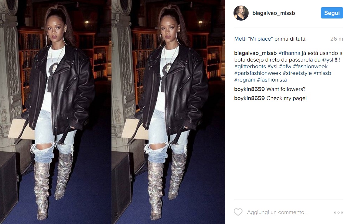 Non sono rimasta sorpresa nel vedere Rihanna indossarli per prima, durante la Paris Fashion Week, la scorsa sera. Peccato, questi bellissimi stivali morbidi ricoperti di brillanti avrebbero meritato un look migliore di quello scelto da Rihanna: il jeans pesante inserito a fatica dentro gli stivali non dona alla sua figura. Un NO secco anche al grosso giacchetto di pelle, più informe che oversize. Un vestitino e un Chiodo avrebbero fatto giustizia a questi meravigliosi stivali.