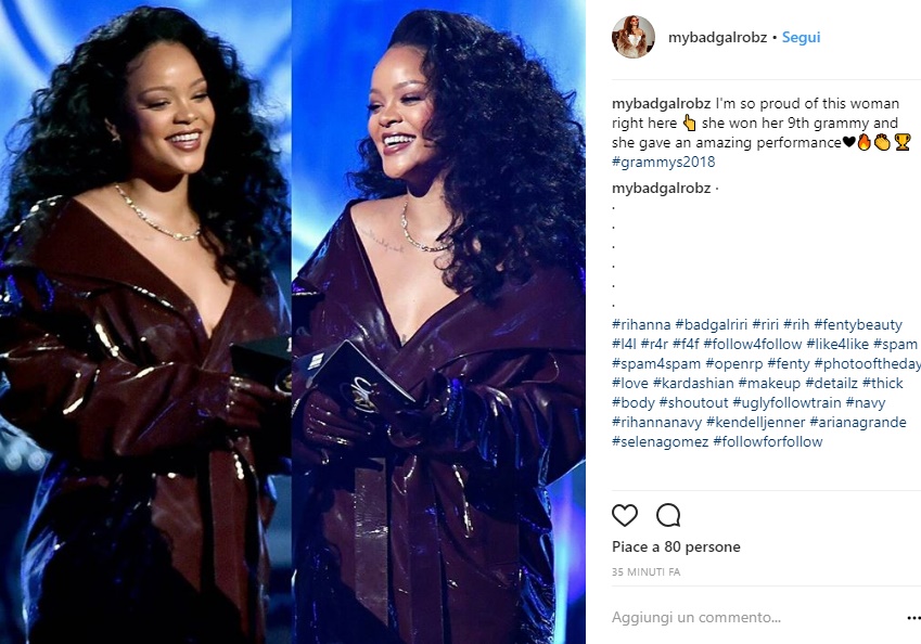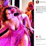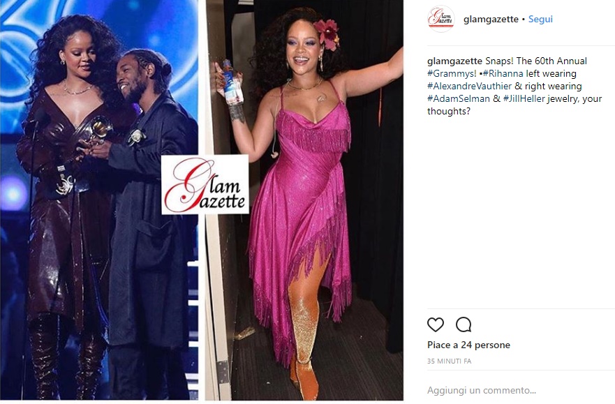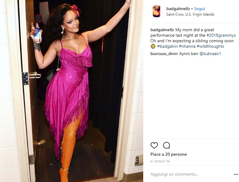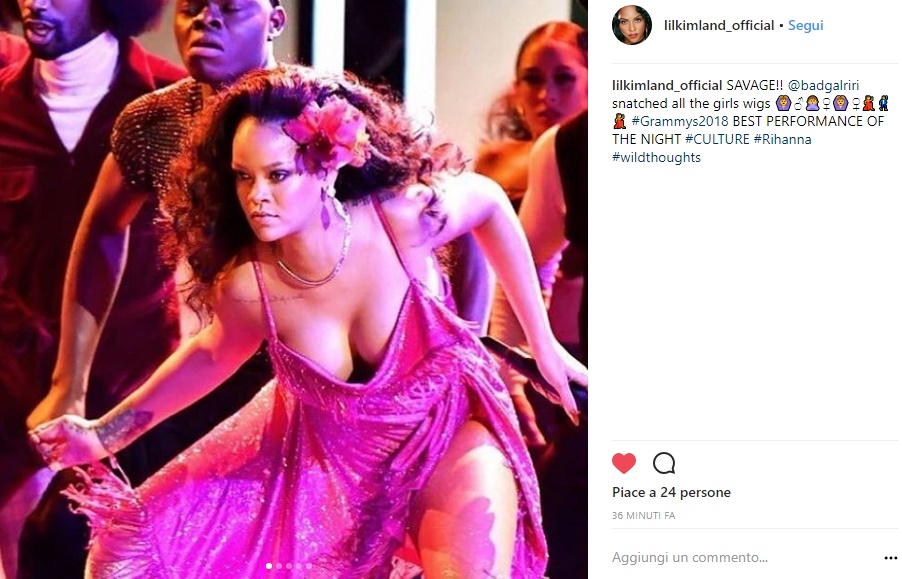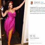 Più tardi, nel bel mezzo dell’evento, Rihanna è salita sul palco indossando un look Adam Selman personalizzato con un tocco di stile flamenco. L’abito, di colore fucsia, era coperto di oltre 275mila cristalli. A calcare lo stile deciso del suo look, delle calze arancioni brillantinate. Un outfit indubbiamente particolare che non è certo passato inosservato.