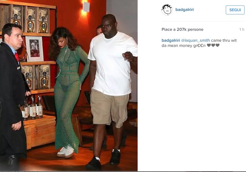 LOS ANGELES – Rihanna, vestito a rete trasparente firmato LaQuan Smith. La cantante ha postato una foto sul suo profilo Instagram in cui indossa un abito dello stilista afroamericano. Si tratta di un capo verde, fatto di tessuto a rete che lascia intravedere la lingerie. Ai piedi Riri indossava un paio di scarpe da ginnastica con zeppa piatta.