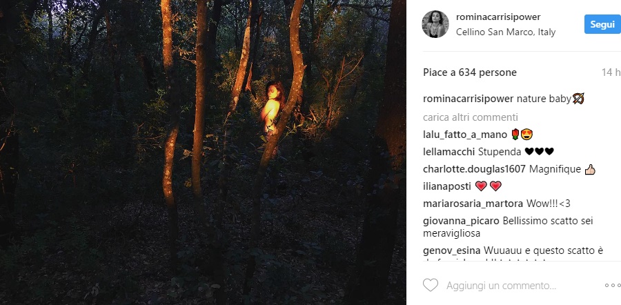 ROMA – Romina Carrisi vedo non vedo: una ninfa tra la natura FOTO. Svolta sensuale per Romina Carrisi, figlia di Romina Power e AlBano, che ha pubblicato su Instagram uno scatto che ha letteralmente mandato in tilt i fan. La bellissima attrice ha postato uno scatto dal sapore bucolico in cui appare nuda tra le piante. Una foto vedo-non-vedo in cui Romina è super sensuale in una posa sexy che non ha nulla di volgare ma, al contrario, rievoca scenari artistici e romantici.