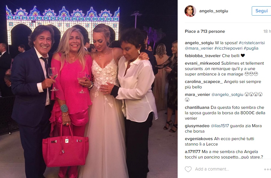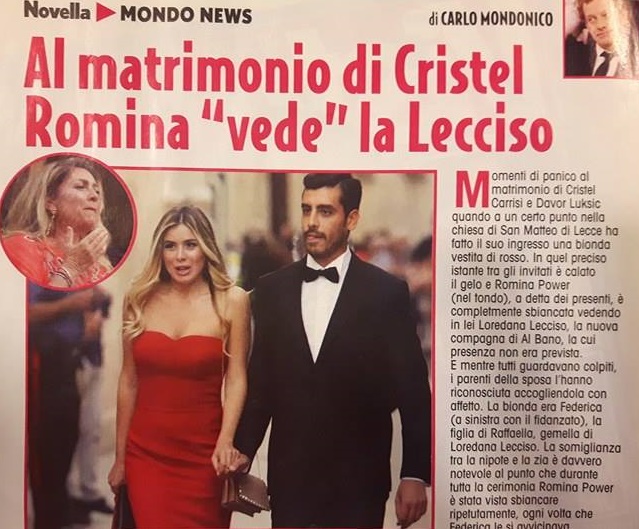 “Momenti di panico al matrimonio di Cristel e Davor quando a un certo punto nella chiesa si San Matteo di Lecce ha fatto visita il suo ingresso una bionda vestita di rosso. In quel preciso istante tra gli invitati è calato il gelo e Romina Power, a detta dei presenti, è completamente sbiancata vedendo in lei Loredana Lecciso, la cui presenza non era prevista. E mentre tutti guardavano colpiti, i parenti della sposa l’hanno riconosciuta accogliendola con affetto. La bionda era Federica, la figlia di Raffaella, gemella di Loredana. La somiglianza tra la nipote e la zia è davvero notevole al punto che durante tutta la cerimonia Romina Power è stata vista sbiancare ripetutamente, ogni volta che Federica le si avvicinava”.