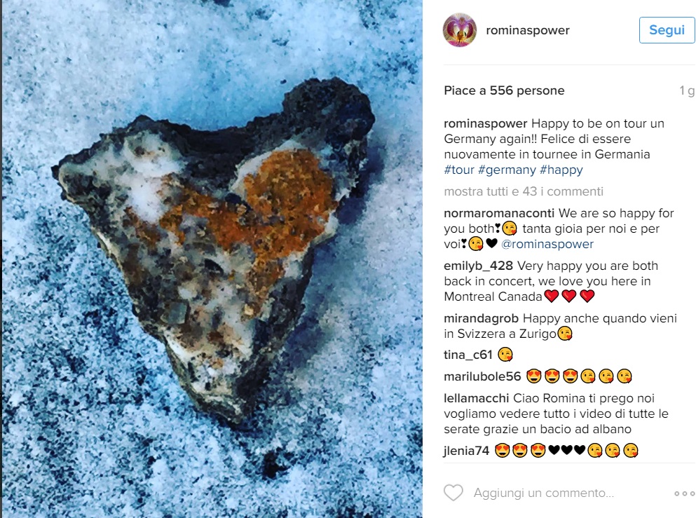 Al di là dei concerti, però, un particolare non è sfuggito agli occhi attenti dei fan: Romina Power in questi giorni sprizza gioia da tutti i pori e non fa altro che condividere cuori su Instagram. In un a prima foto postata sul Social Network, lo scatto raffigura un piccolo sasso che ha tutta l’aria di avere una forma a cuore. A corredo della foto la cantante ha scritto: