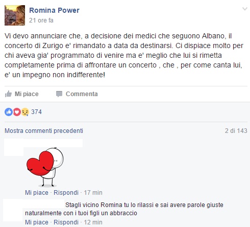 “Vi devo annunciare che, a decisione dei medici che seguono Albano, il concerto di Zurigo è rimandato a data da destinarsi. Ci dispiace molto per chi aveva già programmato di venire ma è meglio che lui si rimetta completamente prima di affrontare un concerto , che , per come canta lui, e’ un impegno non indifferente!”.