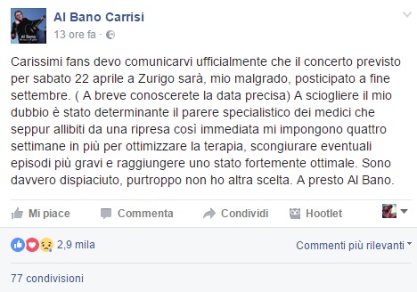 “Carissimi fans devo comunicarvi ufficialmente che il concerto previsto per sabato 22 aprile a Zurigo sarà, mio malgrado, posticipato a fine settembre. ( A breve conoscerete la data precisa) A sciogliere il mio dubbio è stato determinante il parere specialistico dei medici che seppur allibiti da una ripresa così immediata mi impongono quattro settimane in più per ottimizzare la terapia, scongiurare eventuali episodi più gravi e raggiungere uno stato fortemente ottimale. Sono davvero dispiaciuto, purtroppo non ho altra scelta. A presto Al Bano”.