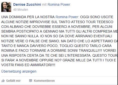 Nonostante i rumors circolati in rete, però, la notizia della cancellazione del tour in Germania non è ancora confermata. Nè Romina né Albano Carrisi, infatti, hanno rilasciato comunicati stampa in merito. Per questo motivo si invita alla calma e ad aspettare che venga diffusa qualche notizia certa dagli uffici stampa dei due cantanti o dai diretti interessati visto che molto spesso Albano e Romina hanno riferito su eventi e news sulle pagine facebook personali o sui propri blog. Noi siamo certi che Albano e Romina non ci deluderanno.