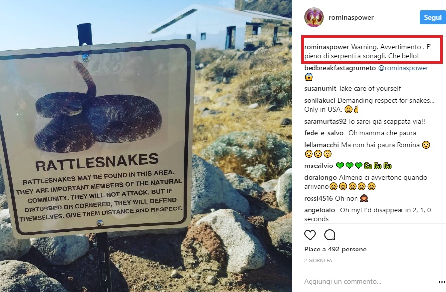 Romina Power si trova nel deserto del South California per un giro turistico. La cantante posta quotidianamente scatti del suo viaggio per tenere aggiornati i propri fan sul profilo Social dedicato alle foto. Una di queste foto però ha alzato una piccola polemica tra gli ammiratori della cantante. Romina ha infatti pubblicato uno scatto di un cartello in cui appare un serpente a sonagli. Si tratta di un cartello di avvertimento che incita le persone a fare attenzione in quanto la zona è piena di serpenti a sonagli, a dir poco pericolosi. A corredo della foto, la cantante ha scritto: