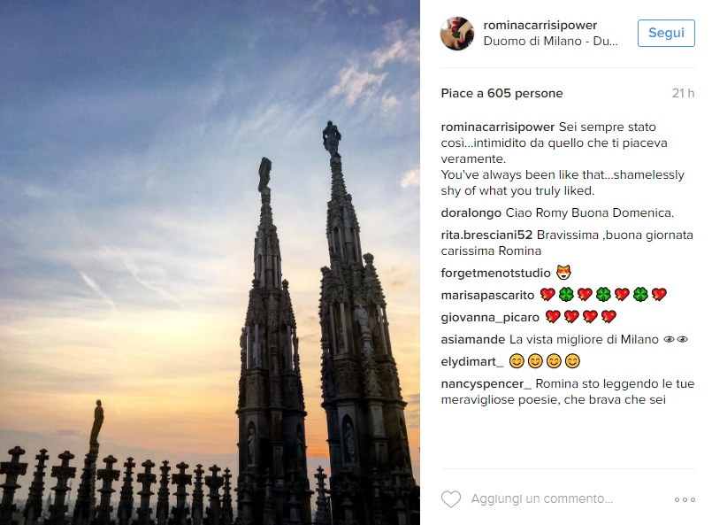 ROMA – Romina Power, figlia Romina, misteriosa frase: “Sei sempre…”. Una strana frase ha innescato un piccolo “giallo” tra i fan di Romina Carrisi, figlia di Romina Power e Albano Carrisi. La ragazza ha pubblicato una foto sul suo profilo Instagram che ha insospettito i fan. Nello scatto appaiono due guglie del Duomo di Milano ma a far scattare il mistero è la frase con cui Romina Carrisi ha accompagnato la foto. La figlia di Albano e Romina ha scritto, sia in inglese che in italiano:
