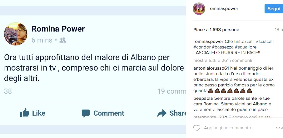 “Ora tutti approfittano del malore di Albano per mostrarsi in tv, compreso chi ci marcia sul dolore degli altri“. A corredo della foto, un commento molto duro: Che tristezza!!! sciacalli condor bassezza squallore LASCIATELO GUARIRE IN PACE!!”.