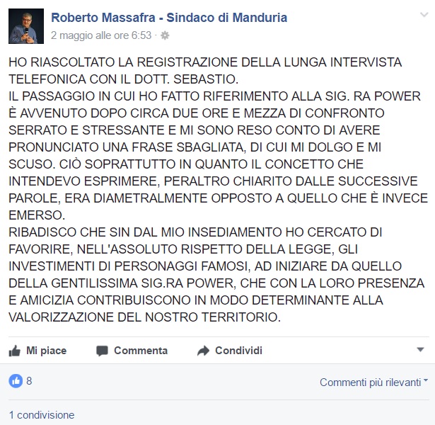 L’intenzione di Romina di abbandonare ogni proposito di investimento in quel lembo di terra non era ancora stata resa pubblica, quando il sindaco di Manduria ha pubblicato sulla sua pagina Facebook un post di scuse. Massafra ha affermato di essersi sbagliato durante l’intervista finita sui vari siti web, attribuendo questa svista alla forte stanchezza dopo più di due ore mezzo di confronto nel consiglio comunale: