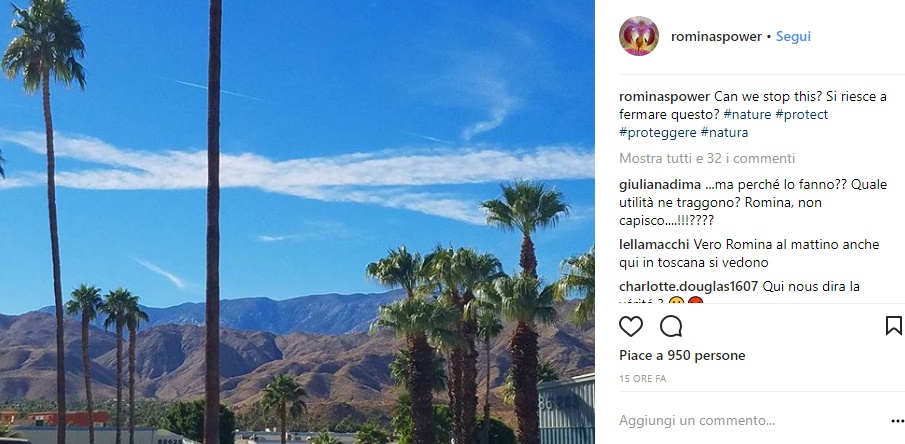 A cosa fa riferimento Romina Power? Già altre volte la cantante ha postato su Instagram foto che sembravano essere dell provocazioni. In uno scatto di giugno scorso, apparivano due scie di condensazione visibili nell’atmosfera terrestre create dagli aerei e, in quell’occasione, Romina aveva fatto riferimento proprio alle ormai famose scie chimiche. La cantante, aveva infatti scritto come didascalia della foto: