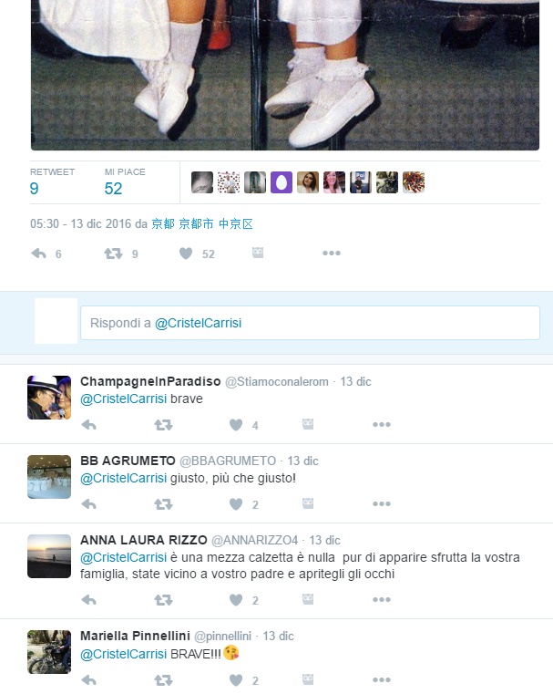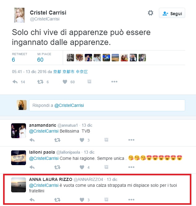 Anna Laura Rizzo scrive su Twitter: “È vuota come una calza strappata mi dispiace solo per i tuoi fratellini” e ancora ” è una mezza calzetta è nulla pur di apparire sfrutta la vostra famiglia, state vicino a vostro padre e apritegli gli occhi”.