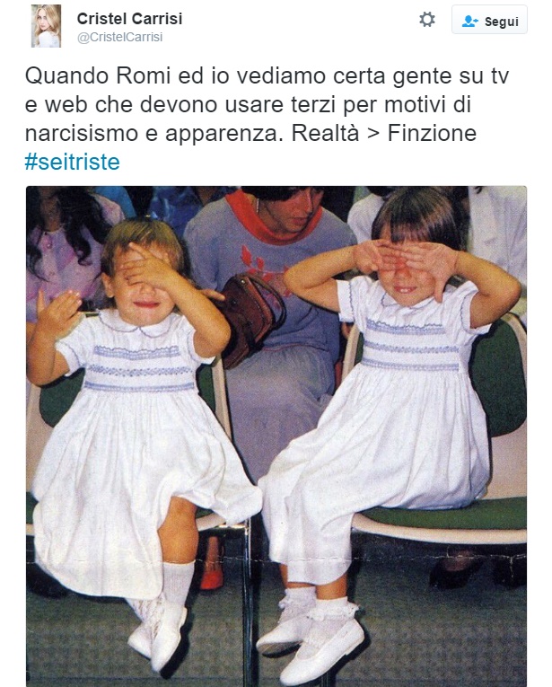 “Quando Romi ed io vediamo certa gente su tv e web che devono usare terzi per motivi di narcisismo e apparenza. Realtà > Finzione #seitriste”. Ancora, Cristel rincara la dose con un altro duro tweet: “Solo chi vive di apparenze può essere ingannato dalle apparenze”.
