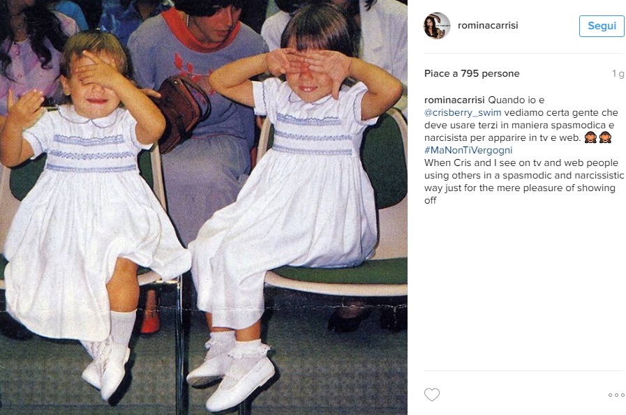 “Quando io e @crisberry_swim (la sorella Cristel ndr) vediamo certa gente che deve usare terzi in maniera spasmodica e narcisista per apparire in tv e web.# MaNonTiVergogni”