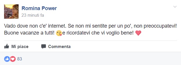 “Vado dove non c’e’ internet. Se non mi sentite per un po’, non preoccupatevi! Buone vacanze a tutti! e ricordatevi che vi voglio bene!”.