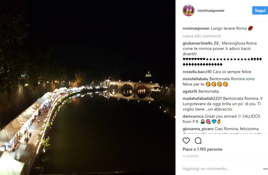 La cantante sta mostrando ai suoi fan la bellezza di Roma pubblicando foto del lungotevere in festa (è iniziata da pochi giorni la manifestazione “Lungo il Tevere”, in cui si alternano bancarelle di oggettistica, ristoranti e localini deliziosi), meravigliose foto di Castel San’Angelo di notte, vicoletti della Capitale e angoli nascosti.