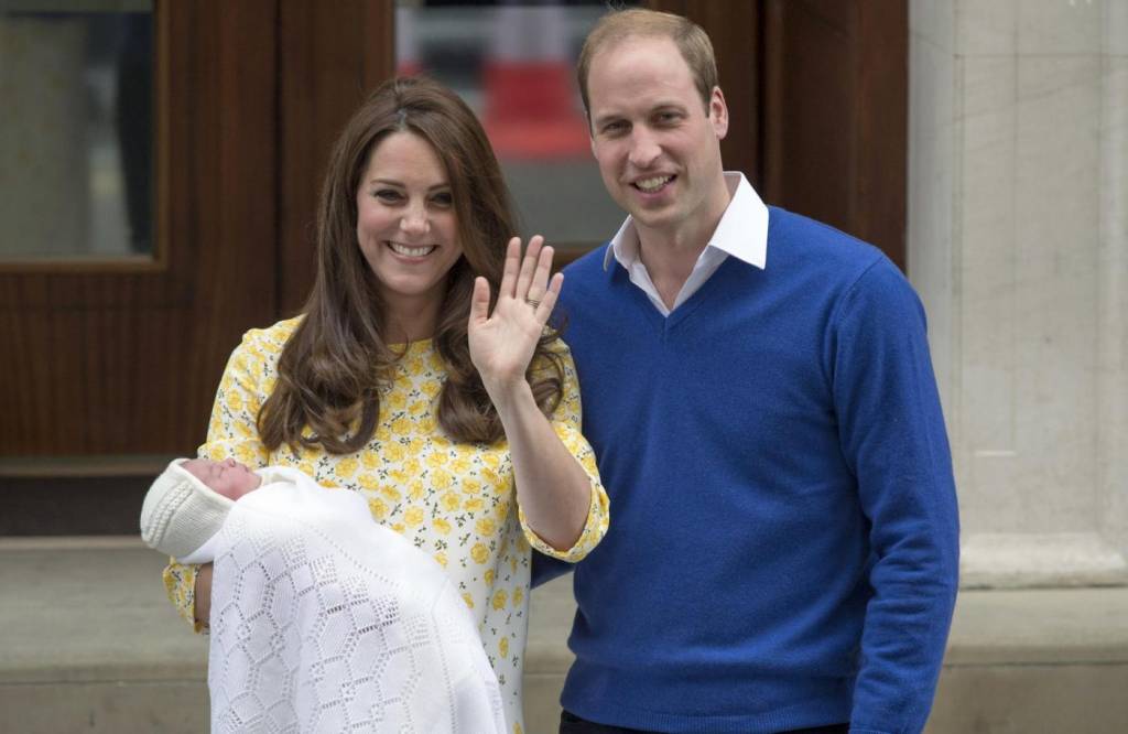 Britain's Prince William, left, and Kate, Duchess of Cambridge, hold their newborn daughter as they leave St. Mary's Hospital's exclusive Lindo Wing, London, Saturday, May 2, 2015. The Duchess gave birth to the Princess on Saturday morning. (ANSA/AP Photo/Alastair Grant)