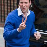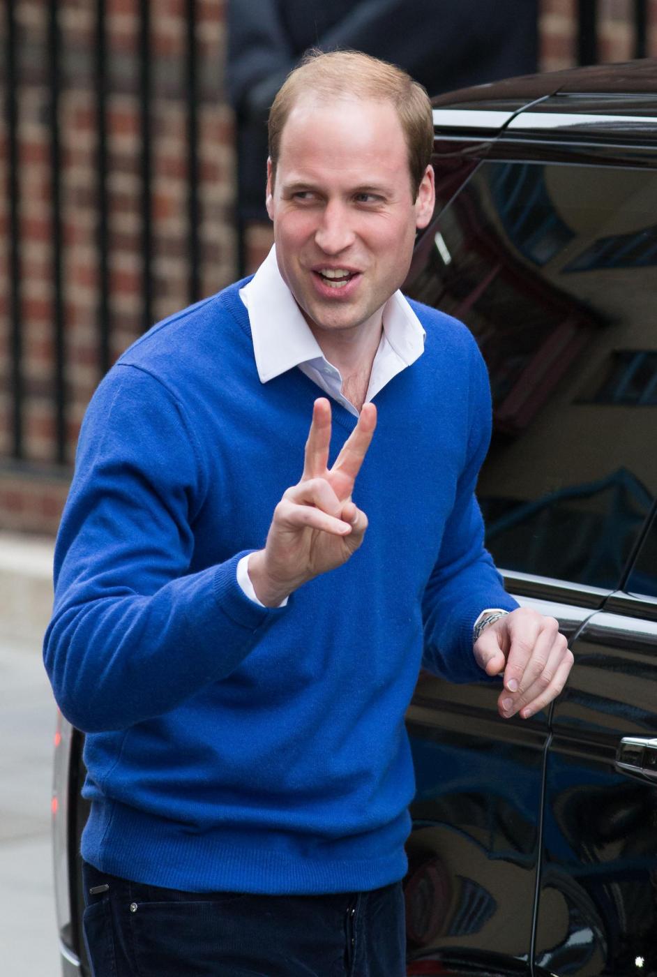 The Duke of Cambridge indicates the birth of his second child as he leaves the Lindo Wing of St Mary's Hospital in London. PRESS ASSOCIATION Photo. Picture date: Saturday May 2, 2015. See PA story ROYAL Baby. Photo credit should read: Daniel Leal-Olivas/PA Wire