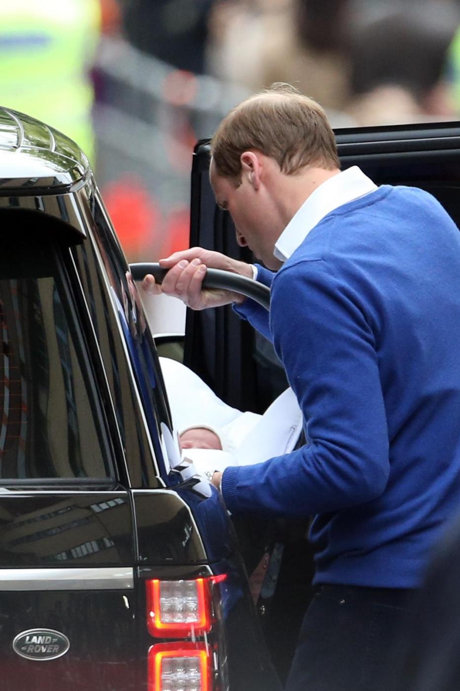 The Duke of Cambridge places his newborn daughter, the Princess of Cambridge, in a car as he and his wife leave the Lindo Wing of St Mary's Hospital in London. PRESS ASSOCIATION Photo. Picture date: Saturday May 2, 2015. See PA story ROYAL Baby. Photo credit should read: Steve Parsons/PA Wire