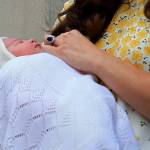 Princess of Cambridge in the arms of her mother the Duchess of Cambridge outside the Lindo Wing of St Mary's Hospital in London. PRESS ASSOCIATION Photo. Picture date: Saturday May 2, 2015. See PA story ROYAL Baby. Photo credit should read: John Stillwell/PA Wire