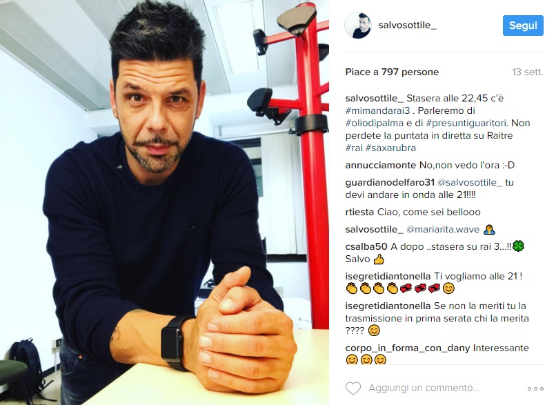 ROMA – Salvo Sottile: età, chi è la moglie, figli FOTO. Giornalista, conduttore e scrittore di successo: Salvo Sottile, nuovissimo presentatore del programma Mi Manda Rai 3 in onda in prima serata, è senza dubbio uno dei personaggi dell’informazione italiana più importanti e di rilievo degli ultimi anni. Classe ’73, Salvo Sottile ha 43 anni ed è nato a Palermo. Figlio di dell’ex capocronista del quotidiano palermitano Giornale di Sicilia, Salvo Sottile ha iniziato le collaborazioni da giornalista fin da giovanissimo, ad appena 16 anni. La sua carriera, poi, è stata in ascesa. Nel 1992 è stato assunto da Enrico Mentana come corrispondente di Palermo del TG5. Salvo Sottile è stato reso celebre per i suoi servizi sui processi della mafia e le morti di Giovanni Falcone e Paolo Borsellino, ma anche per il suo lavoro svolto, come inviato, a New York (al tempo della caduta delle Torri Gemelle), in Afghanistan e a Kabul. Una lunghissima carriera a Canale 5 e al TG5, poi a Rete 4 forse per la sua conduzione forse più amata, quella a Quarto Grado; ancora a Sky Tg24 come volto del primo telegiornale all news in Italia, per poi approdare a La7 e concludere su Rai 1 con “Estate in diretta”.