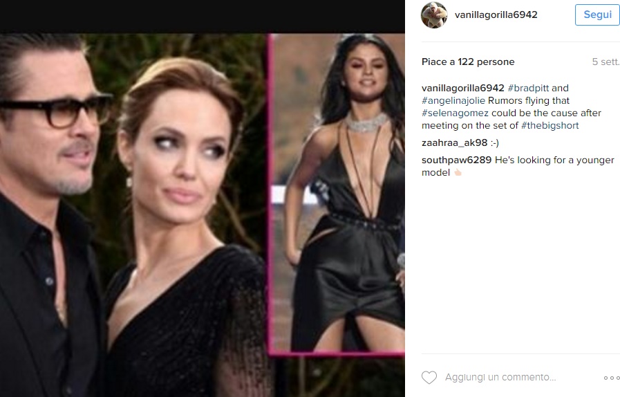 “Angie si è arrabbiata quando ha visto su Instagram la foto si Selena e ha sentito da alcuni amici di come Brad e Selena flirtavano spudoratamente. Ora Selena si è vantata con tutti che farà un nuovo film con Brad Pitt. Selena sta andando in giro chiamando con ironia Brad “il mio futuro marito” e Angie, ovviamente, non è contenta”.