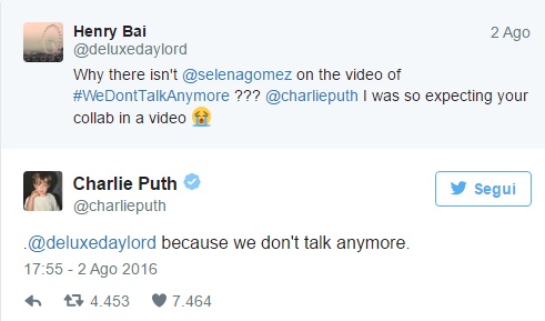 Una risposta che potrebbe essere ironica (visto che questo è proprio il titolo della canzone) ma che ha fatto nascere un vero e proprio mistero. Possibile che i due abbiano litigato? Selena e Charlie, dopotutto, erano ormai amici da molto tempo tanto che in molti hanno pensato che tra loro poteva esserci anche del tenero. Non si sa dunque se la risposta del cantante sia solo una provocazione per richiamare il titolo della canzone, fatto sta che la sua affermazione ha messo la pulce nell’orecchio a molti. Sarà vero che i due non si parlano più? E se così non fosse, come mai Selena non appare nel video, nemmeno per un cameo? E dire che appena un mese fa Charlie aveva partecipato al Revival Tour ad Anhaeim aprendo la data in questione e salendo sul palco in compagnia di Selena per cantare proprio We Don’t Talk Anymore. Non solo: quando Selena ha compiuto 24 anni lo scorso 22 luglio, Charlie le ha fatto i suoi migliori auguri su Instagram. Insomma, non vi era nulla nell’aria che lasciasse presagire un presunto litigio.