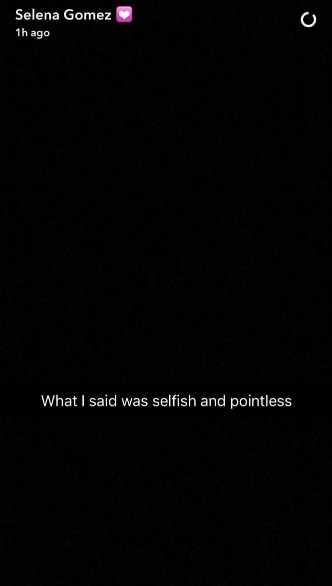 Ora però, mentre Justin ha cancellato il suo profilo su Instagram (qui per saperne di più), sembra che Selena abbia fatto un passo importante scusandosi con l’ex fidanzato tramite Snapchat. La cantante ha postato una foto con sfondo nero con su scritto: